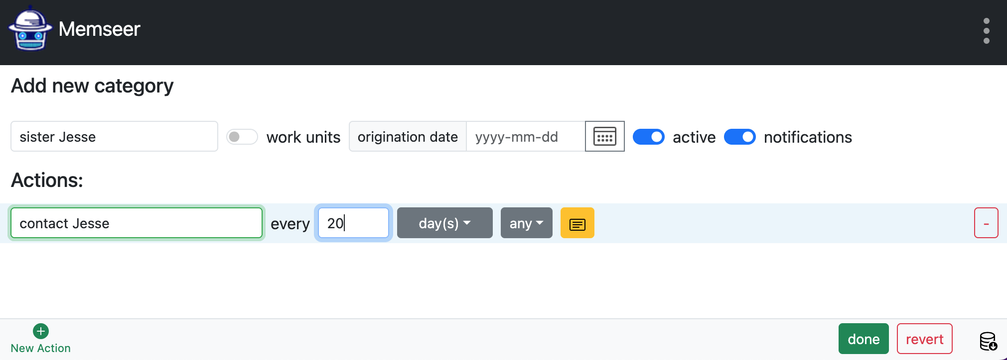 You will be redirected to the main dashboard. In the bottom left corner click on “+ New Category”. Create a new category, give it a name (say sister Jesse), perhaps add an action: “contact Jesse” every 20 days.