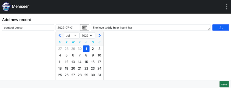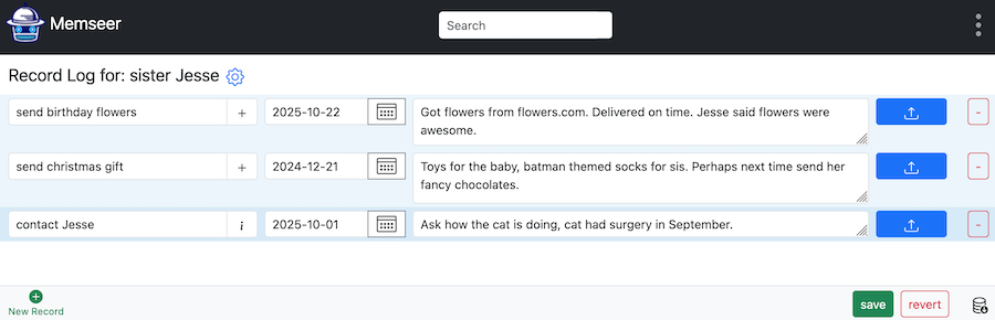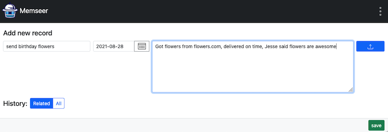 Back in the dashboard, you can see the next time you should contact Jesse. More over you can add another record, let’s say you want to remember a flower shop that had great selection and delivered on time. Click “+ New Record”, give it a name (ex.: “send birthday flowers”), pick a date when you sent flowers, add notes and click “save”.