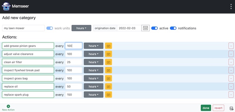 You will be redirected to the main dashboard. In the bottom left corner click on “+ New Category”. Create a new category, give it a name, call it “my lawn mower”. Click “work units” and select “hours” from the dropdown. Let’s choose the “origination date” as the manufacturing date, it can be approximated to a year if you don’t remember when it was purchased. Now it is time to set the actions, click “+ New Action” under actions and populate the fields, so it reads as: “clean air filter every (repeats every) 25 hours”. Let’s keep adding new actions, click “+ New Action” for every new action: