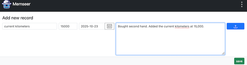 Don’t worry — this is a one-time action for new records. Click “add current kilometers” (or the red icon), enter the current reading, and click “save”. Once you’re back on the dashboard, you’ll see an estimate of when the next chain inspection will be due. You can also add more actions around this record. For example, if you want to inspect the chain every six months, regardless of mileage, create a new action called “Inspect chain every 6 months.” Memseer will then remind you to perform the inspection half a year after the last one.