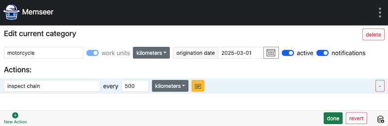 You will be redirected to the main dashboard. In the bottom left corner click on “+ New Category”. Go ahead and create the new category. Give it a name, check “work units” and select “kilometers”, don’t forget to select “origination date” in order to have proper scheduling. Now add the new action by clicking “+ New Action” and filling out: “inspect chain every 500 kilometers”, then click “done”.