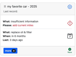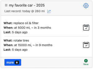 Please note: at the current pace of 200 miles per day, you will hit you first oil change in less than one month. But perhaps you don’t drive 200 miles per day and only done 200 miles this one time. No problem, just keep adding records to the category, Memseer will recalculate your daily average as more information arrives.