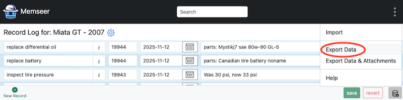 Click “Export Data & Attachments”. A zip file will be saved to your device under the category’s title, for example: Miata GT.zip. This archive will contain Miata GT.csv along with all attached files.