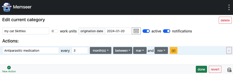 This example illustrates cat care, where the cat needs to take medication every 3 months during the outdoor season.