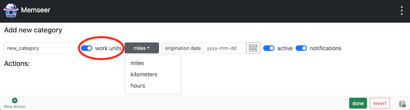 Work units is an optional field for the record that appears whenever the category has work units enabled. Work units field comes with three options: kilometers, miles or hours. Here is an example: