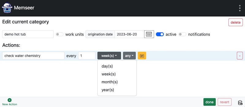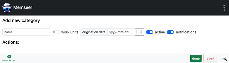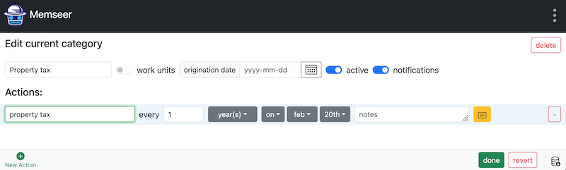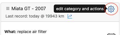 Category is something you want to keep an eye on and/or take care of. It can be a vehicle, device, personal health, special days, holiday and more. Each category contains records - in order to keep a log and actions to be performed if so desired.